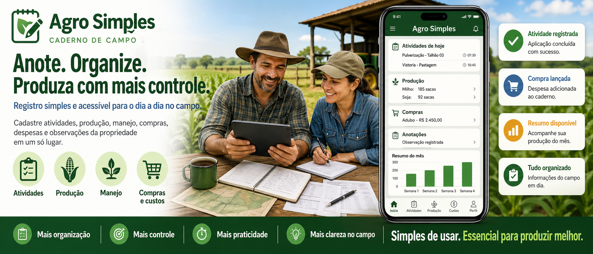 Caderno de campo digital para registrar atividades, organizar rotinas produtivas e acompanhar informações importantes da propriedade.