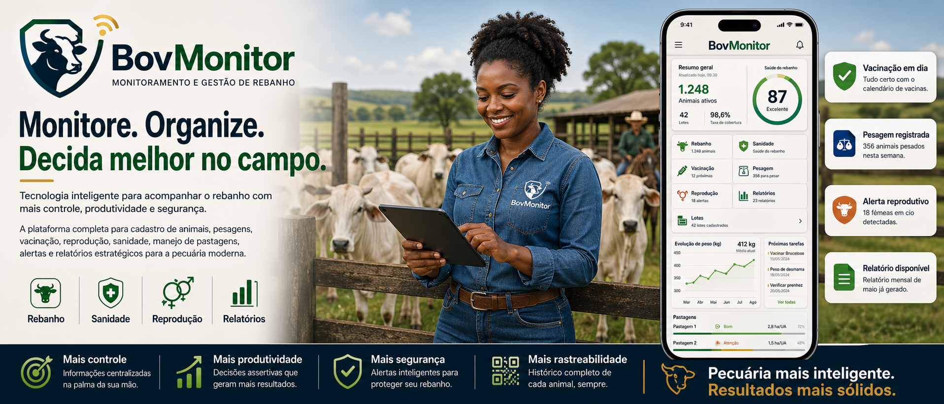 Sistema para gestão e acompanhamento de rebanhos, fases produtivas, manejo, sanidade e indicadores pecuários.