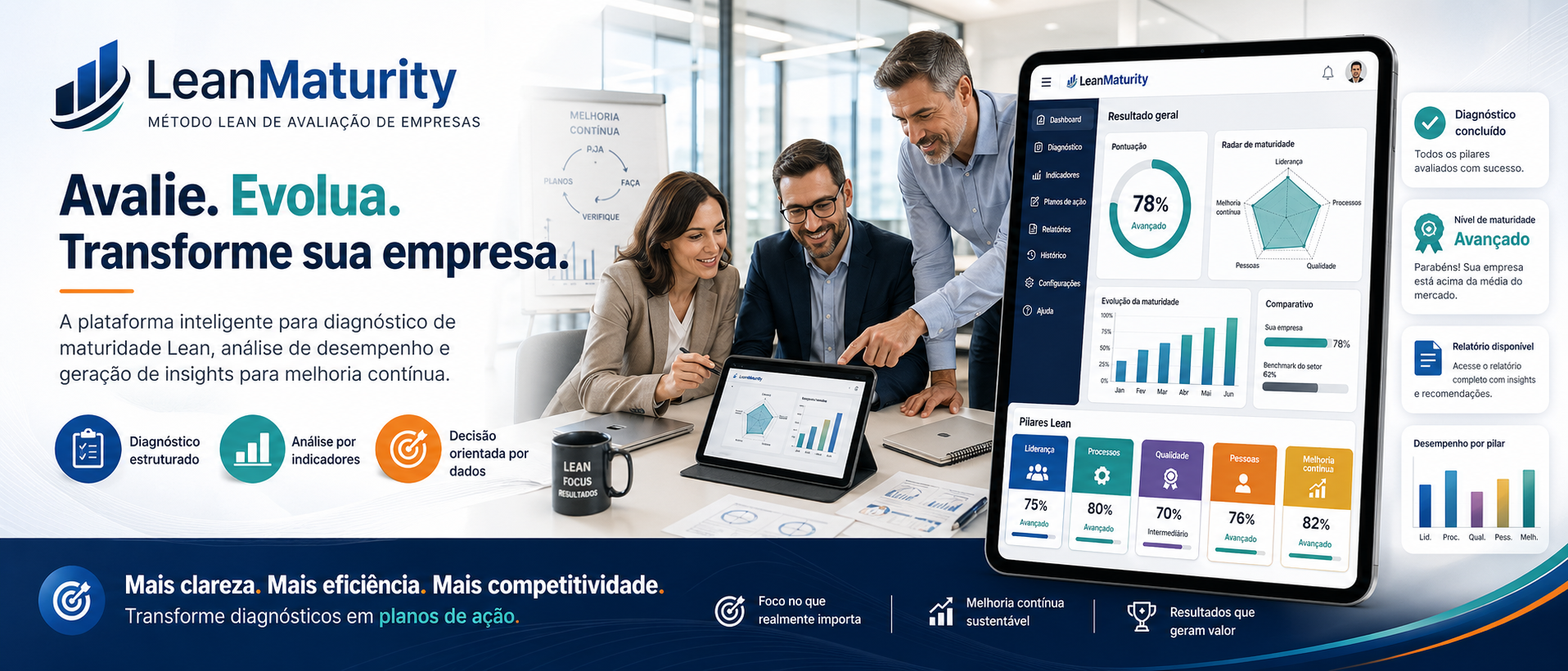 Aplicação de diagnóstico empresarial baseada em maturidade Lean, melhoria contínua e análise visual de desempenho.