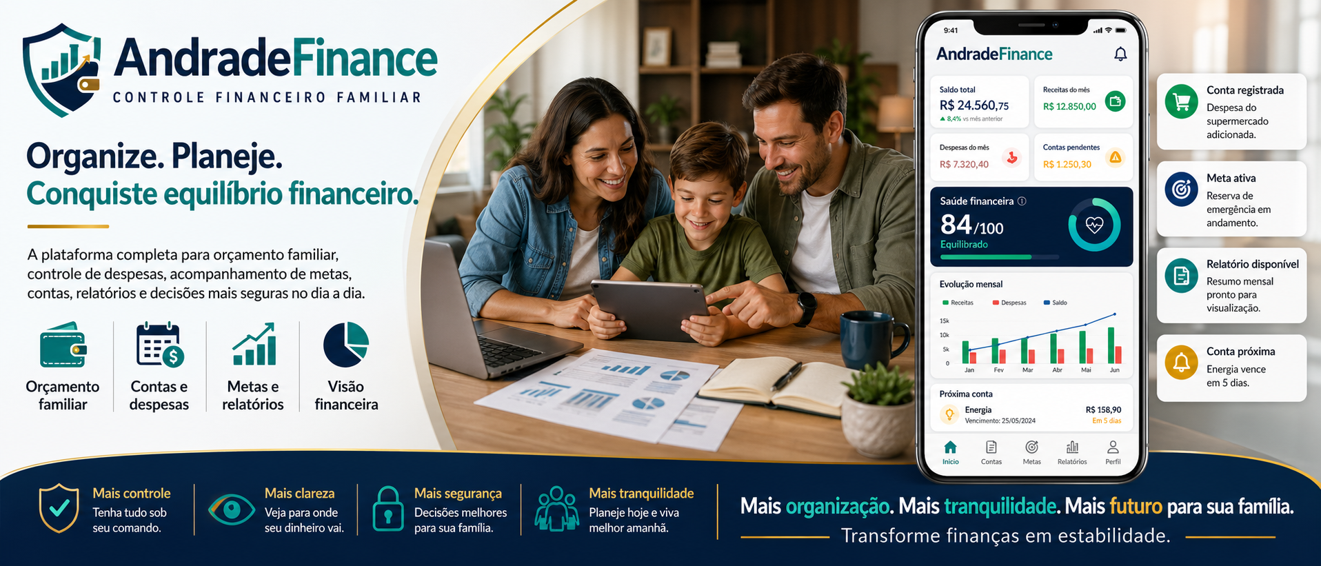 Aplicativo de gestão financeira familiar para organizar receitas, despesas, contas, metas e planejamento.